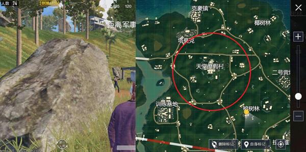 这里给大家推荐如图所示的点位,在这个点位附近有非常多的小型资源点,相信最近经常玩雨林的同学都知道,雨林图的资源是非常丰富的,只需要搜集2到3个资源点就能够基本满足前期战斗的需要,就算相比热门点位也毫不逊色(因为热门点位的生存压力也很大),这里我给各位开黑的朋友提一个小建议,我们可以在降落后分开搜集这些小资源点,然后由队长标记集合地点,集合后在一起进行突围转移,这种方法无论是在效率上还是安全程度上都非常的优秀。