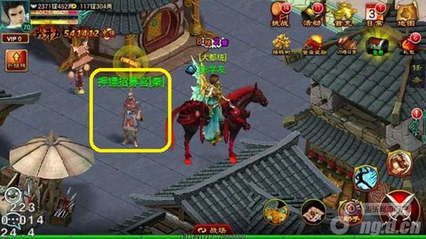 发布“运镖”任务的NPC是“押镖招募官”,一副很瘦弱的样子,还带着点猥琐……他站的地方在王城地图左侧偏上的位置,不太起眼。接受“运镖”任务每次会消耗15点体力。