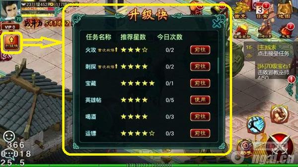 相信初次接触征途的玩家都想知道怎么快速升级吧?上来跟着主线任务一直走(点啊点啊的,单手搞定无压力^_^),很快就可以等级20+。这时你会发现升级的速度开始慢下来了,该怎么办呢?老鸟来告诉你——点击屏幕左侧的那个“升级快”的按钮,系统就会展示给你当前可以获得大量经验的一些体力任务,今天,就给大家来说说这些个任务。