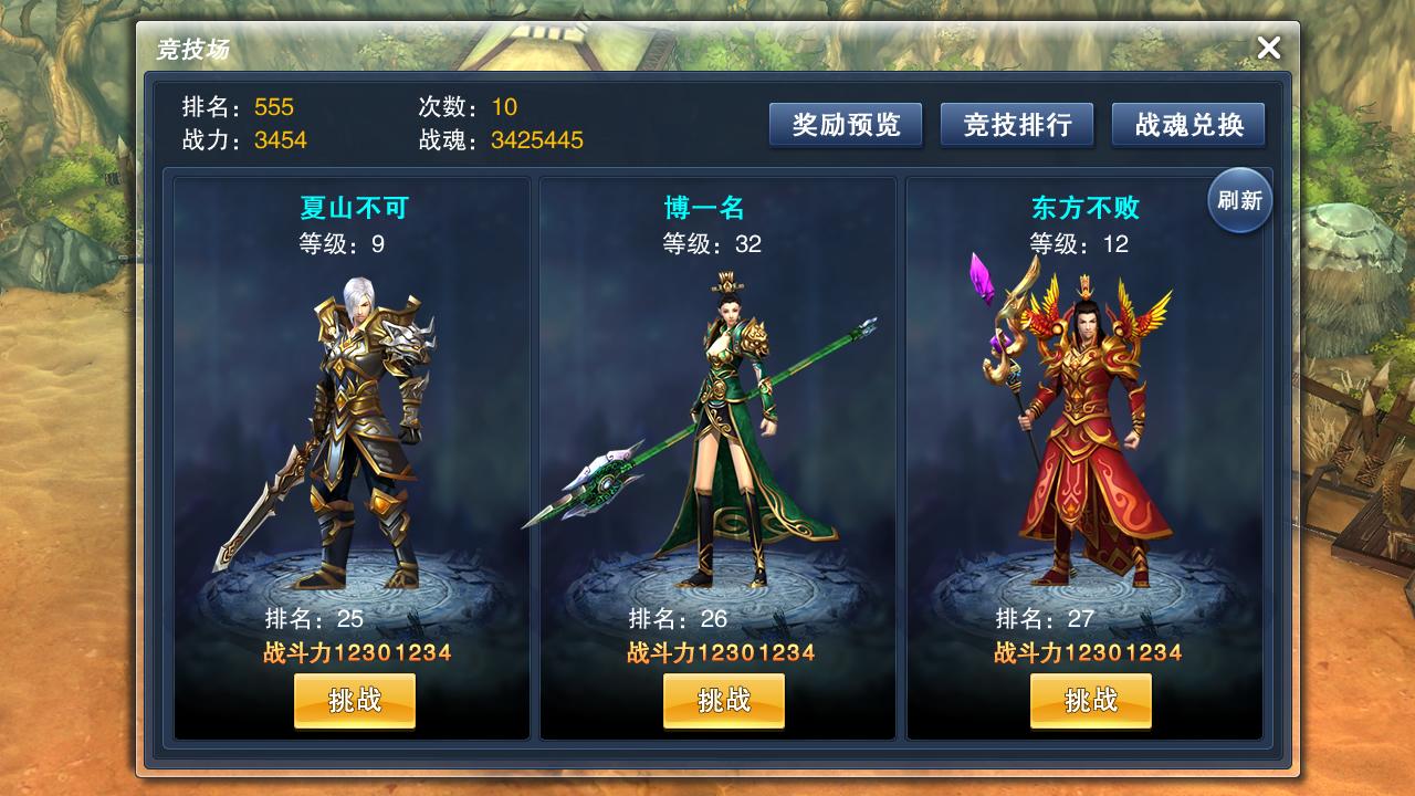 (3)玩家等级达到25级后开启竞技场系统,根据玩家等级竞技场分为三个层级:"低级竞技场"、“中级竞技场”、“高级竞技场”。