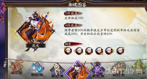 薙魂四件套效果:携带者有50%的概率使友方单位受到的单体攻击伤害减免20%,并分担此次伤害的50%