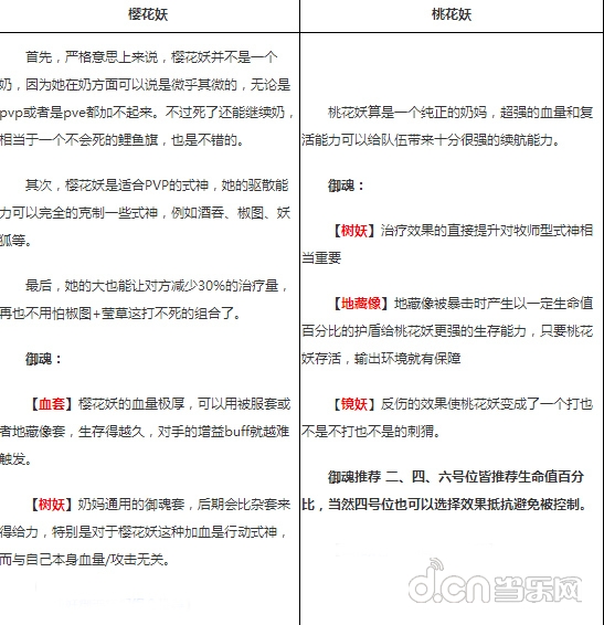 两个式神之间的差别还是非常大的,都是属于辅助奶妈型的式神,论奶量的话桃花妖还是更胜一筹,可以带来更多的生存续航能力,需要给队伍带来更多的增益效果的话,樱花妖则可以发挥的更好的。在pvp中针对特定的阵容,驱散能力可以给队伍增加几分胜算。不过就目前而言,小编个人认为两个式神的都算不上特别热门,奶妈的话首推还是萤草。