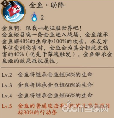 另外金鱼可以吃到多重加成,比如辉夜姬和镰鼬的抵抗防御加成等,这些都是金鱼姬的绝佳队友。而金鱼姬觉醒描述中可以继承抵抗的最大收益就体现在了这层「多重继承」上。