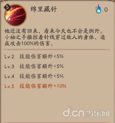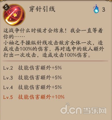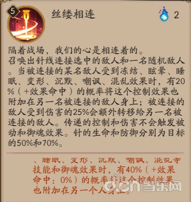 2、丝路相连,召唤针线连接选中的敌人和一名随机敌人,这两个只要有个被控制,另外一个就有概率也受到相同控制效果。(满级40%,这里命中加成应该不止0%)
