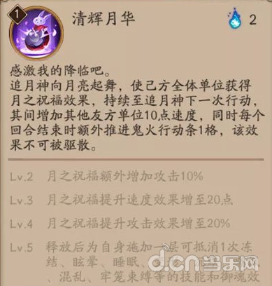 【月之祝福】的20%攻击加成还可以与晴明的言灵·星、一目连的盾等攻击加成技能叠加。比如一个暴伤250%的玉藻前,在【月之祝福】的加持下相当于有了300%暴伤。由于【月之祝福】能让追月神免疫一次控制,使得只要行动一次,就更难被打断,相比经常速度垫底的辉夜姬更不怕控制。
