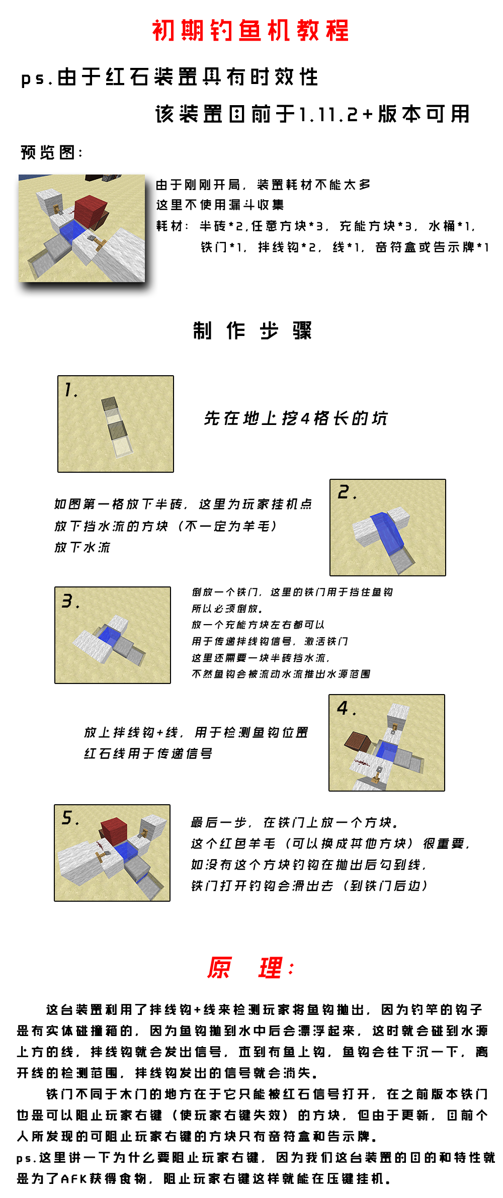 钓鱼机:建造起来最简单原理最易懂的红石装置之一,缺点是需要挂机,而且玩家需要去杀蜘蛛获得线(如果运气好钓鱼时吊起一只有经验