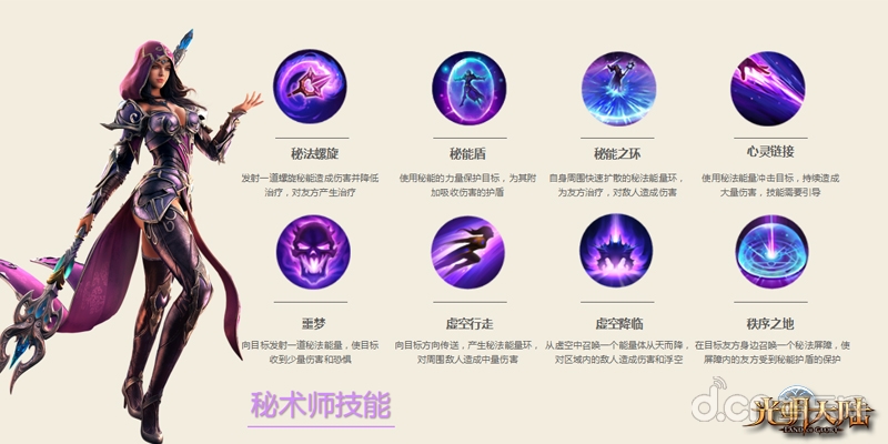 秘术师是《光明大陆》中颇具特色的职业,光暗同体,随心切换。在40人团队副本中,玩家会看到作为输出职业的秘术师和作为治疗职业的秘术师,这其中的专精切换将会涉及到后续提到的转职和符文。
