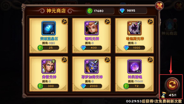 在神元商店中,玩家每天都有5次免费刷新商店内容的机会,如果使用完了,就需要等待刷新,一般为10分钟,如果你拥有沙漏,就可以让时间快进,直接刷新商店内容,这样,就可以使用神元或者钻石购买你想要的道具了。