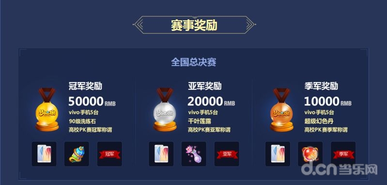 为了鼓励更多的高校玩家前来参赛,这次,《梦幻西游》手游高校PK争霸赛秋季赛同样为参赛战队准备了惊喜大奖!从海选赛到城市赛,再到全国总决赛,每个阶段都有丰厚奖励等你来拿。其中,全国总冠军战队将获得5万元现金大奖、90级洗炼石、游戏内的高校PK赛冠军称谓!除此之外,作为本次赛事的冠名方,vivo也将为冠、亚、季军团队各送上vivo手机5部!这一切,都体现出《梦幻西游》手游满满的诚意。相信这些丰厚的奖励,一定能够鼓励每一支战队,拿出自己的最高水平,展示出高超的PK技艺!