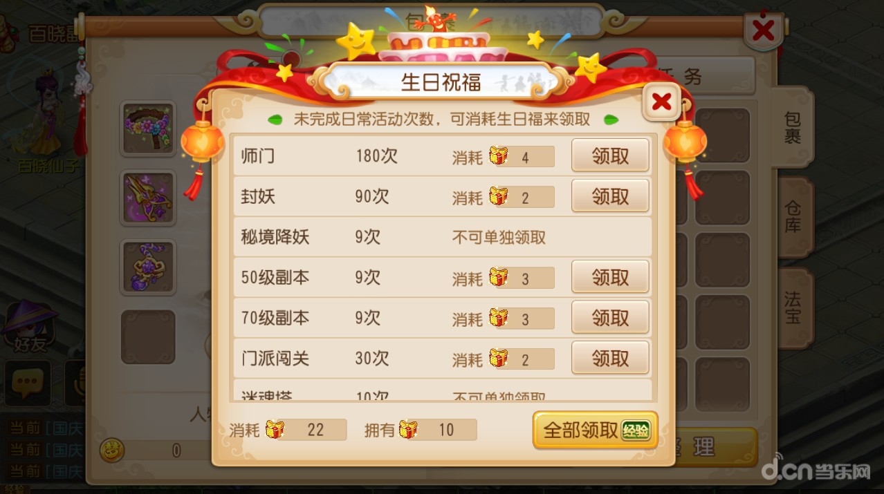 从9月29日~10月14日,等级≥40级的玩家在完成日常任务的过程中,将可获得生日祝福道具,而使用生日祝福道具可以寻回自己在前一天错过的日常以及节日经验,让玩家都能全身心投入愉快假期之中!而且,过多的生日祝福道具还可以转赠朋友或是通过分解获得一定银币奖励!