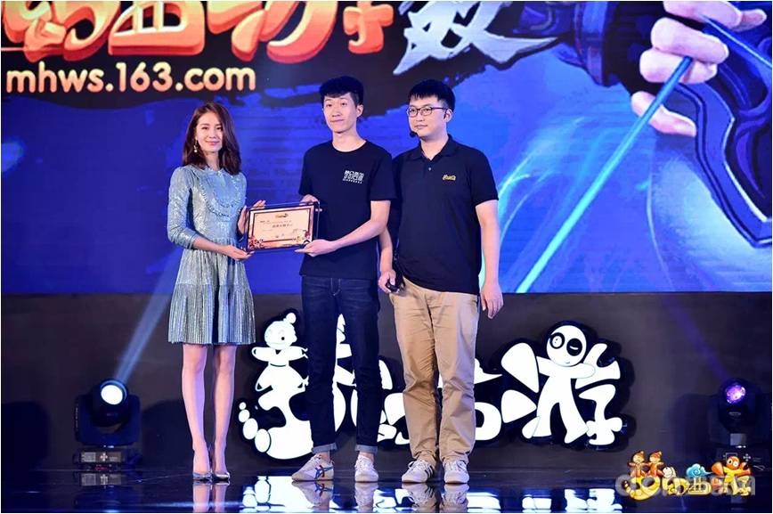在公布了一系列游戏更新内容之后,接下来《梦幻西游》无双版制作人翟健庄先生也在现场宣布了“首席小狮子征选”活动的获奖玩家,并邀请其上台,接受由刘诗诗颁发的“首席小狮子”奖状并与其合影留念。