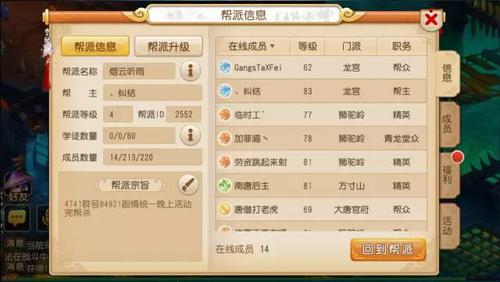 虽然强大的帮派也许能让你很有面子,但是对于在帮战时间很难上线的深夜党来说,更务实地选择一个财政稳定,对帮战要求不高(比如没有强制规定帮战出勤率)的帮派很重要,不然也许哪一天上线你就发现自己已经成为了无帮派人士。