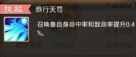 技能:恭行天罚,召唤兽自身命中率和致命率提升0.4%