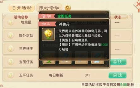 想要让我们的宠物快速的升级的话,就需要我们使用一些资源了。像神兽丹就是其中一个效果非常好的,主要的效果就是能够为我们大家的宠物增加1000万的经验。主要的获取方式大家可以在我们的日常任务中获得,像宝图任务,或者是一些其他的活动也都是可以的。