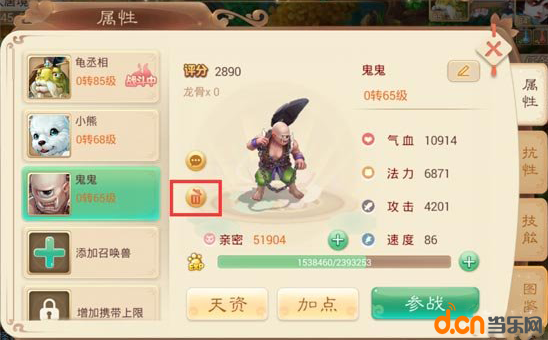 2、点击垃圾桶图像。在召唤兽界面,天资上方。就可以直接放生了。