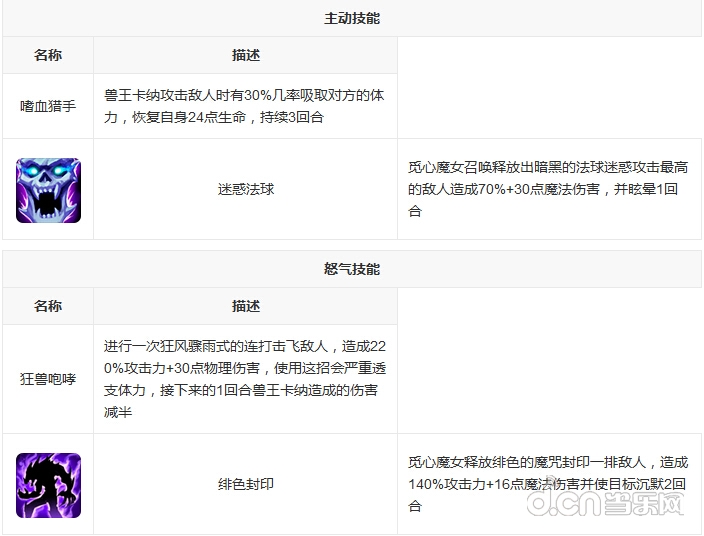 兽王卡纳作为前排的输出来说属于肉盾型输出,战斗中的续航能力较强。被动技能为嗜血猎手能够在攻击后有几率吸取对手的体力补充自己。同时其主动技能能够减少对手的怒气,能有效确保对敌人群攻DPS的控制。而怒气技能更是能够为自己在一回合内提供伤害减半的特效。除去纯坦克的英雄来说,兽王卡纳是前期最为使用的前排角色之一了。