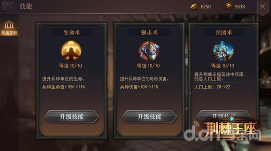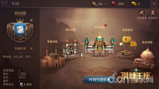 除了丰富的活动外,军团还为军团成员们准备了丰厚的补给支撑。玩家可以进入军团“军事学院”学习升级“生命术”、“强击术”以及“兵团术”,提升兵种作战能力以及“荆棘王座”中兵团出战的总人口上限。