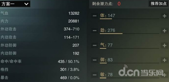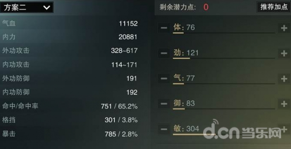 这里其实我更推荐劲体加点,求稳一些。因为本人操作习惯比较耿直,同时脸比较黑,跟别人比少一个暴击属性,所以我很少选择这种赌运气的输出。人物每次升级可以获得四点潜力点,一般1点加体3点加劲这样加下去就够用。上图里我的劲点的稍微多一些,还手欠点过几个敏。全按照1:3去加的话,等升到八九十级的时候能到一万四五左右的气血值,这个血量打副本的时候一不小心吃了几下boss的伤害也不至于直接就没了,有一定容错率。这图里的属性是我装备不太好,带着一身30级绿装时候的属性。如果装备也跟得上的情况下血量是很够用的,输出也不低。我就这个属性的时候五人去打侠士十二连环坞的时候,同队都是等级比我高七八级的华山和武当,我的输出也不比他们差太多。