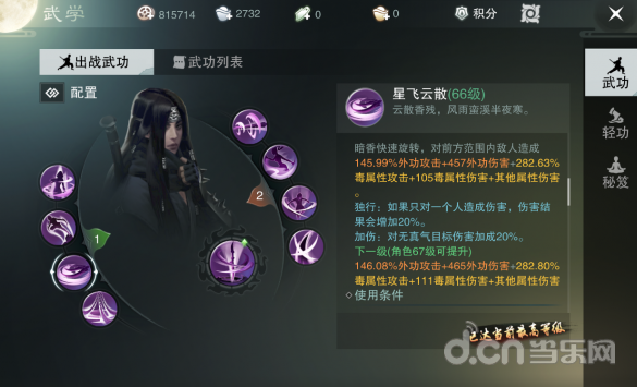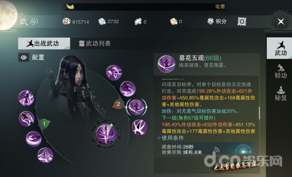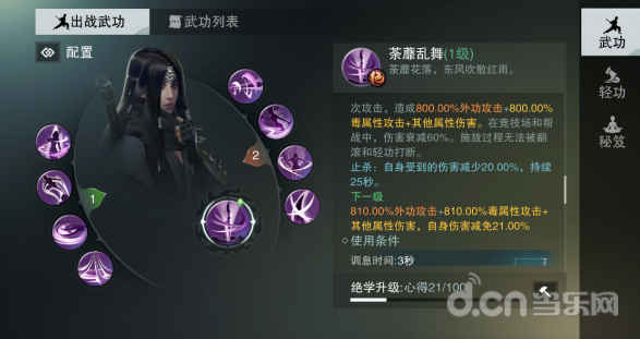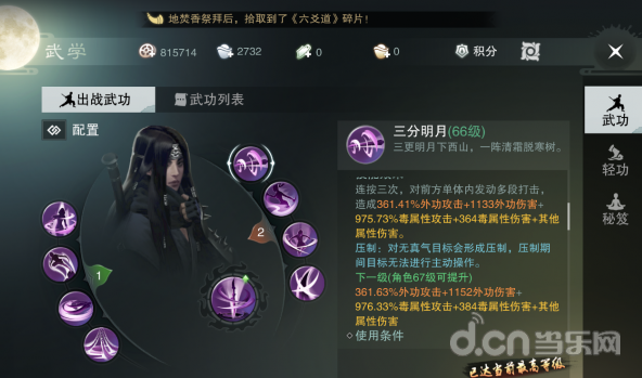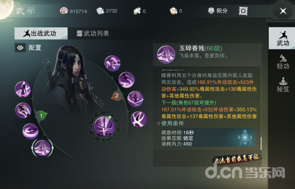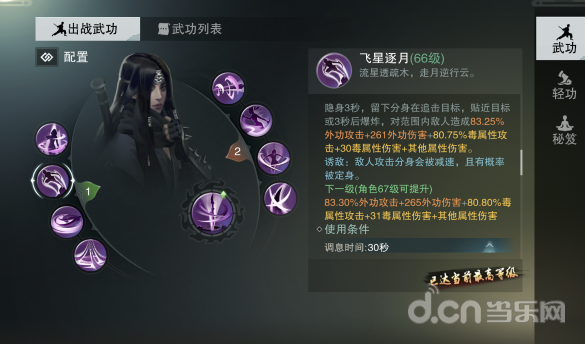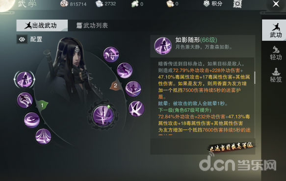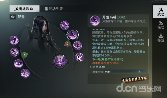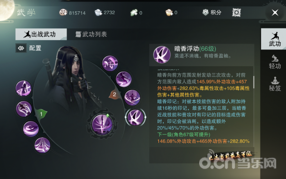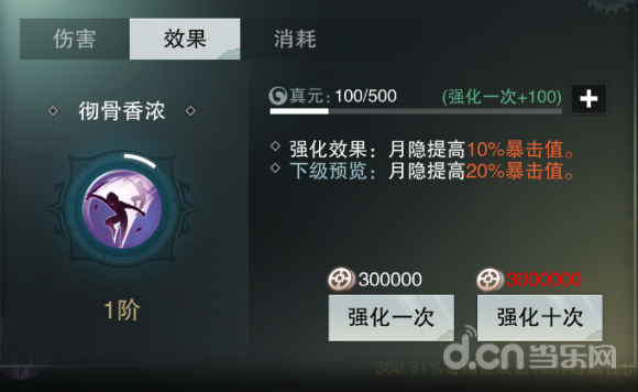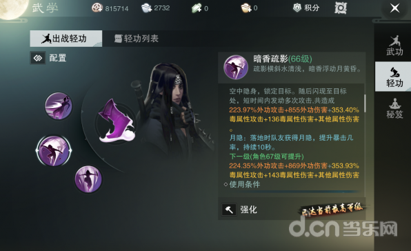 调息时间超长的轻功技能暗香疏影也是要拿来切入的。因为如影随形调试时间也不短。需要靠着这两个技能轮流使用才能频繁切入。然后使用轻功暗香疏影切入后会获得一个buff月隐,能十秒内提高暴击。所以这里强化轻功的时候推荐主要强化效果(土豪可以无视这里)。毕竟赚钱不容易,强化彻骨香浓效果,能更大提升输出。一下很痛和每一下都很痛相比当然是后者更好一些。
